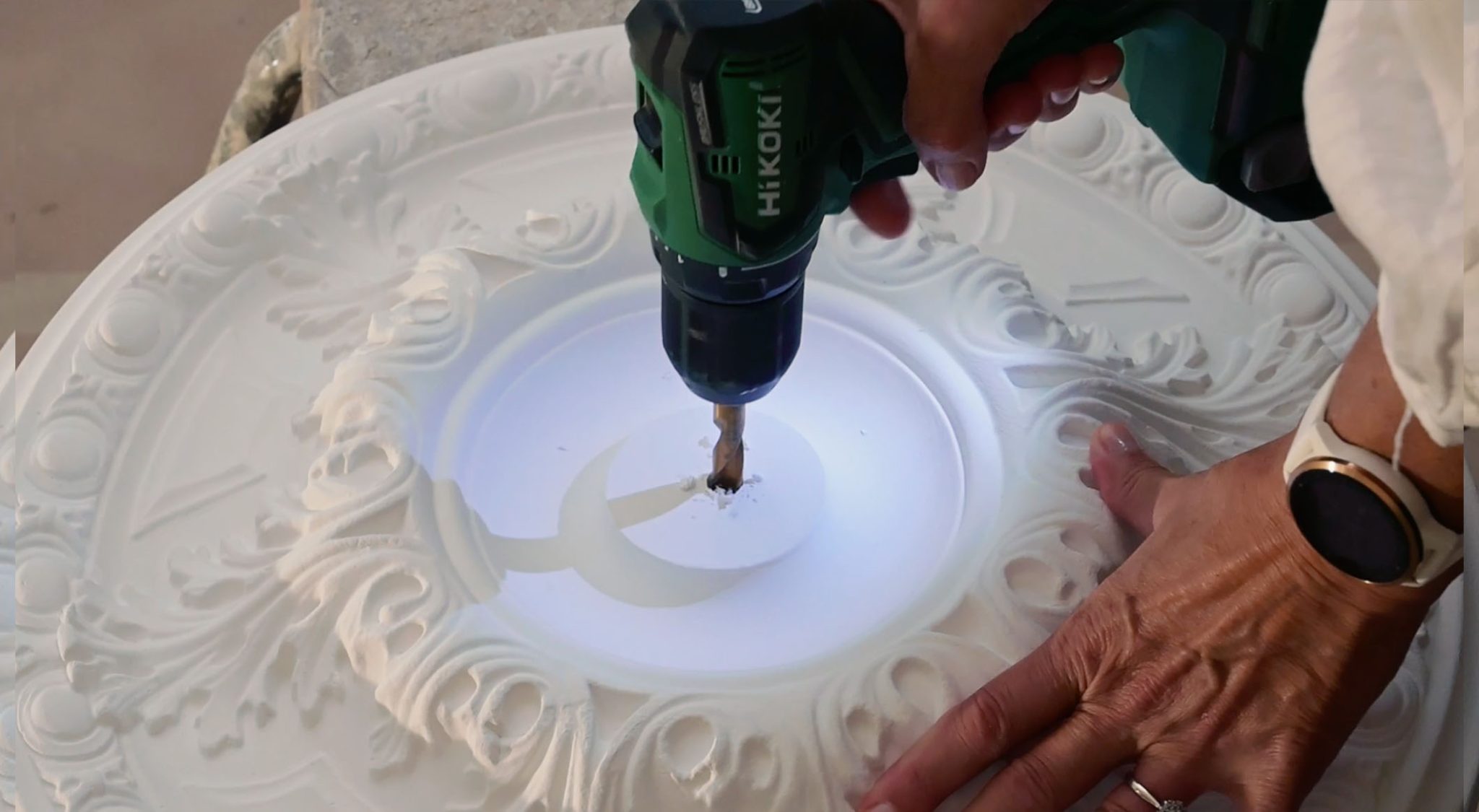 Dersom du skal ha en lampe hengende under rosetten din må du starte med å borre et hull til ledningen i midten av rosetten. Materialet er enkelt håndterlig og svært lett å tilpasse.