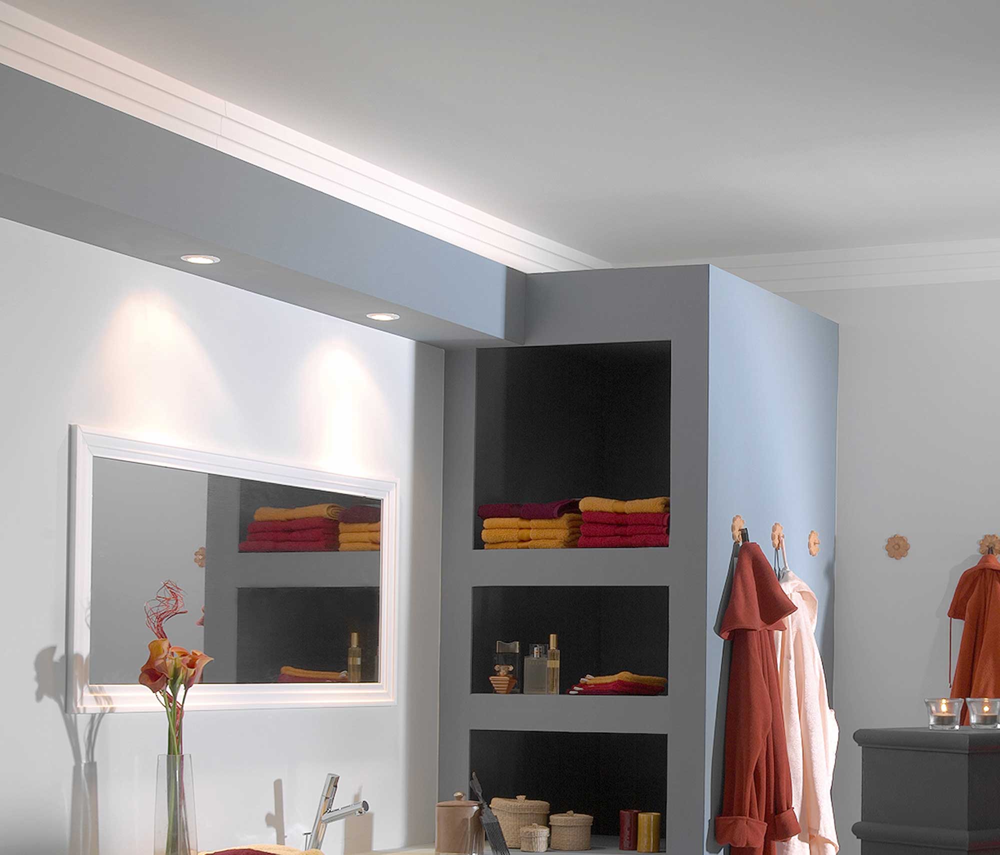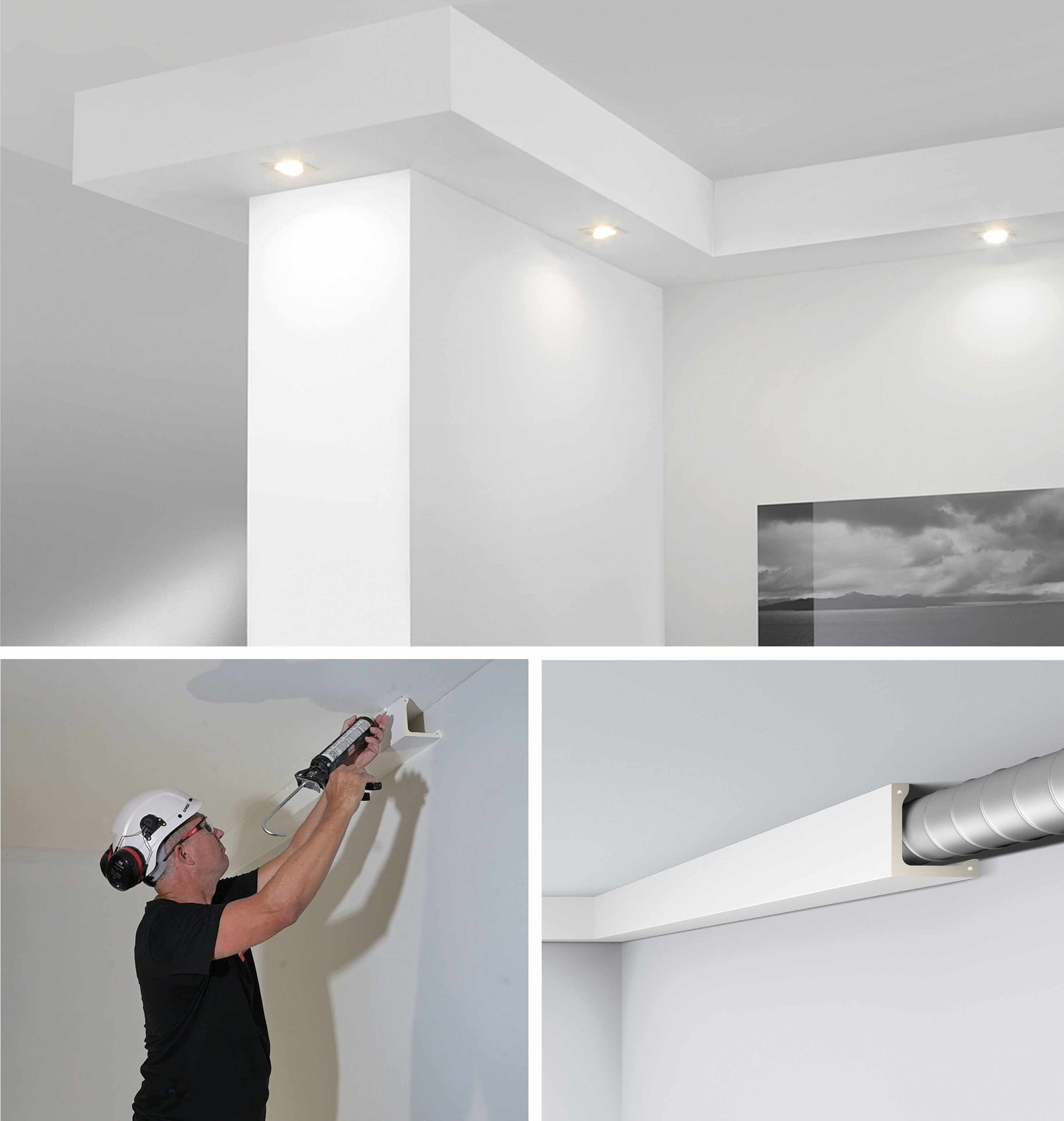 Deco Systems leverer ferdige L-profiler som er klare til å limes rett opp. Ideelle til å kasse inn rør, montering av downlights, skjuling av sprinkleranlegg, ventilasjon og ledninger.